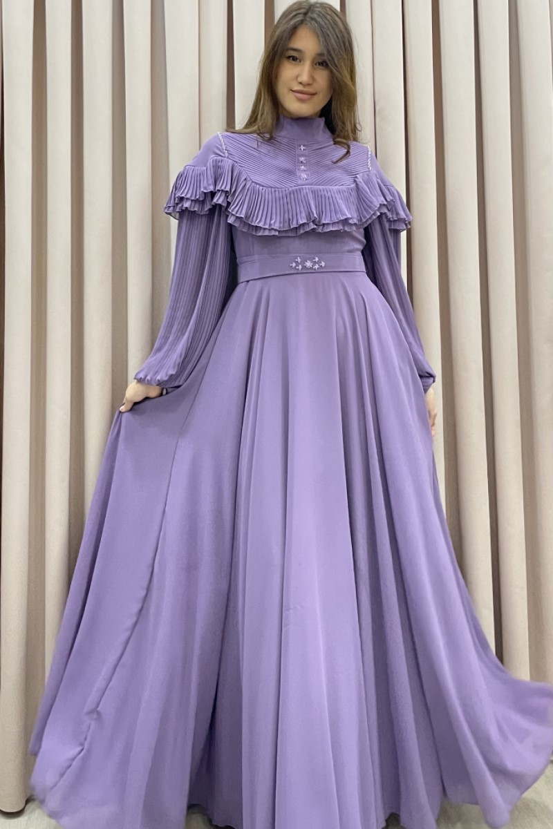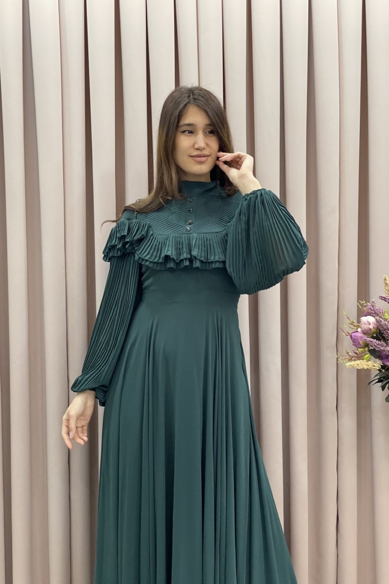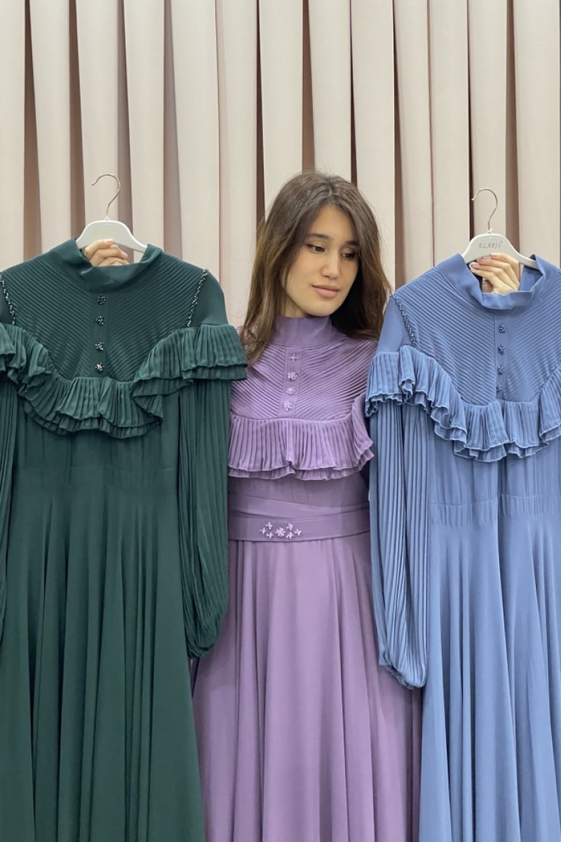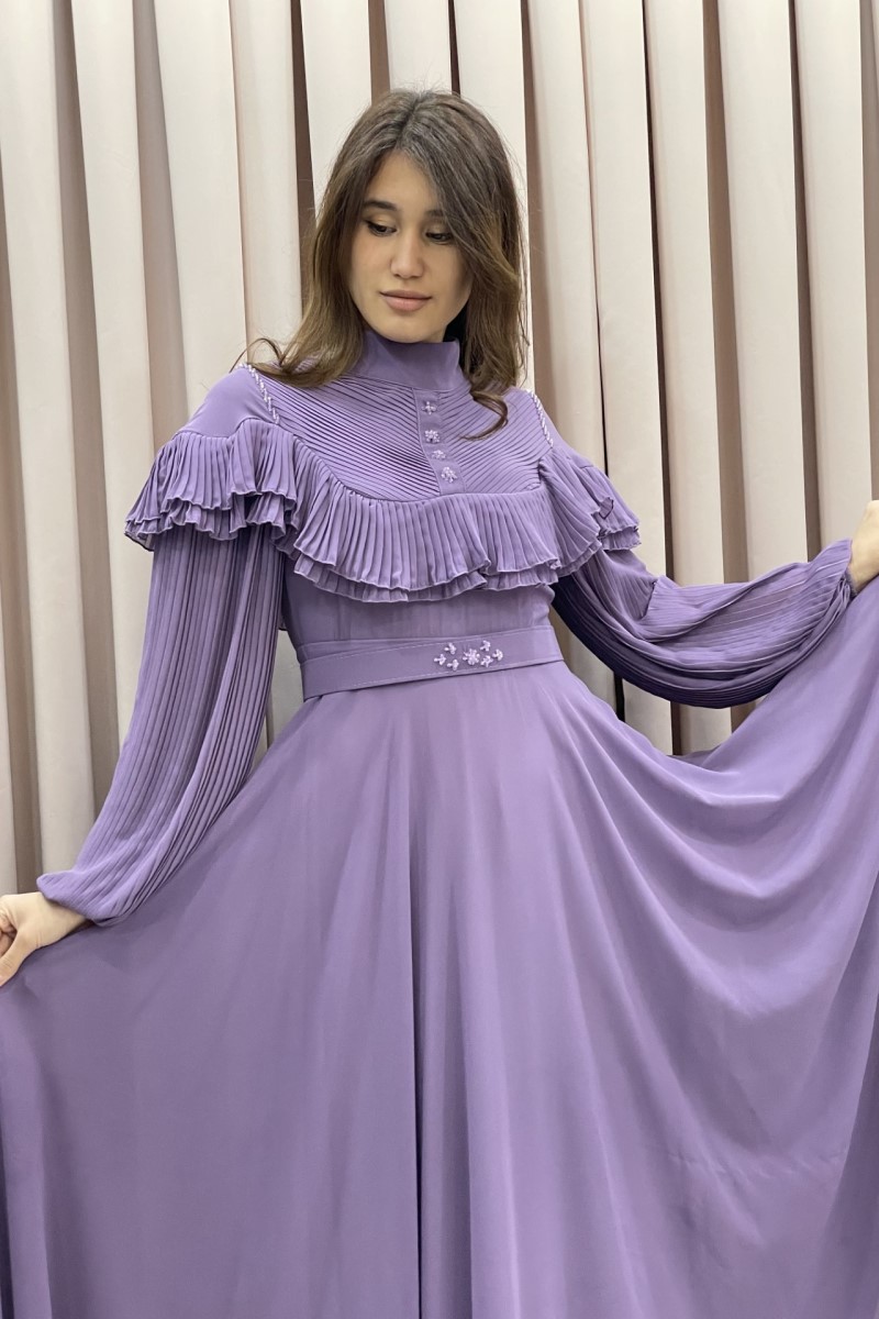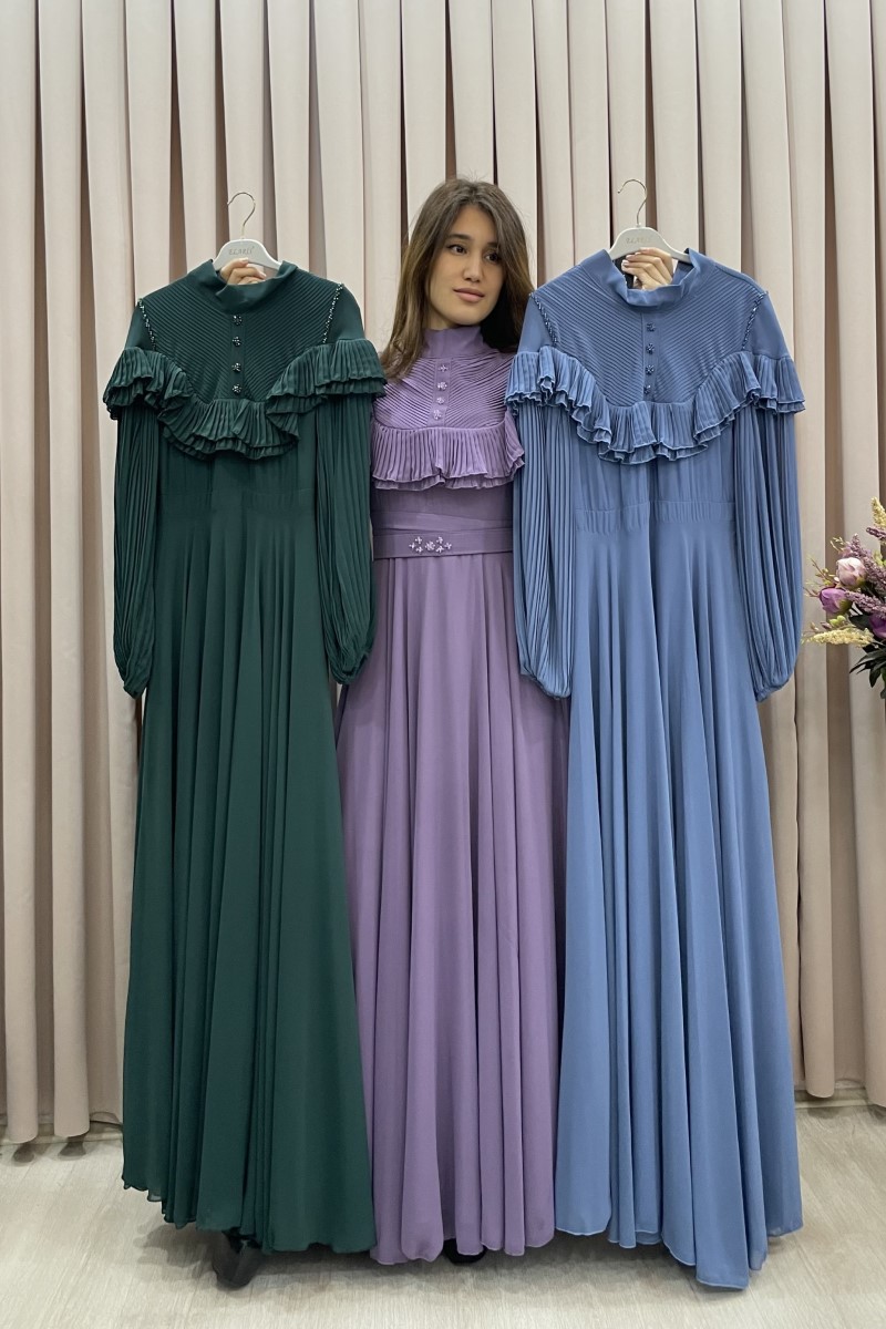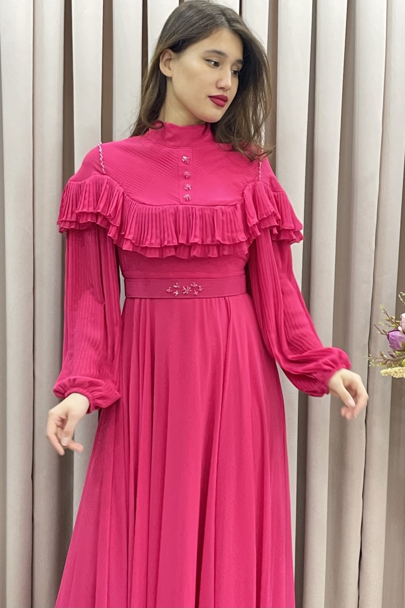 1003 Plise Kollu Şifon Elbise